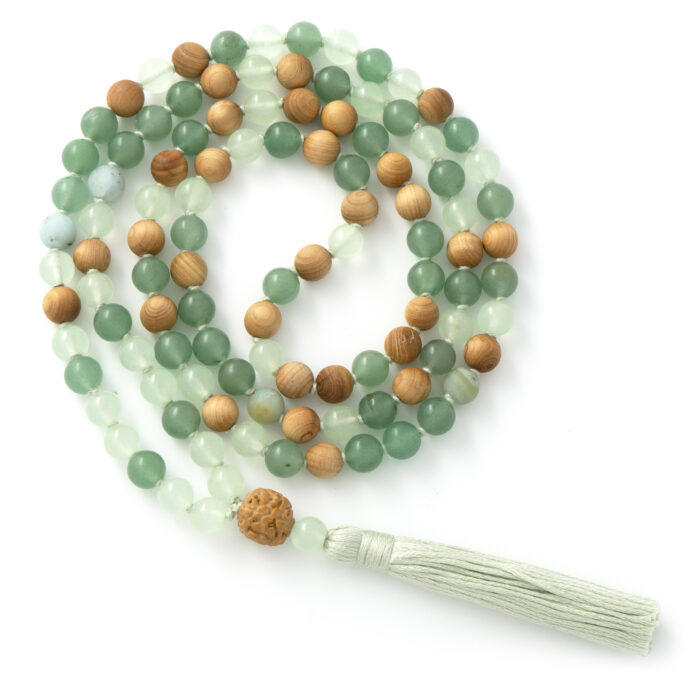 Green Aventurine, Soft Jade, Amazonite & Rudrakshra – Temple Meditation Mala