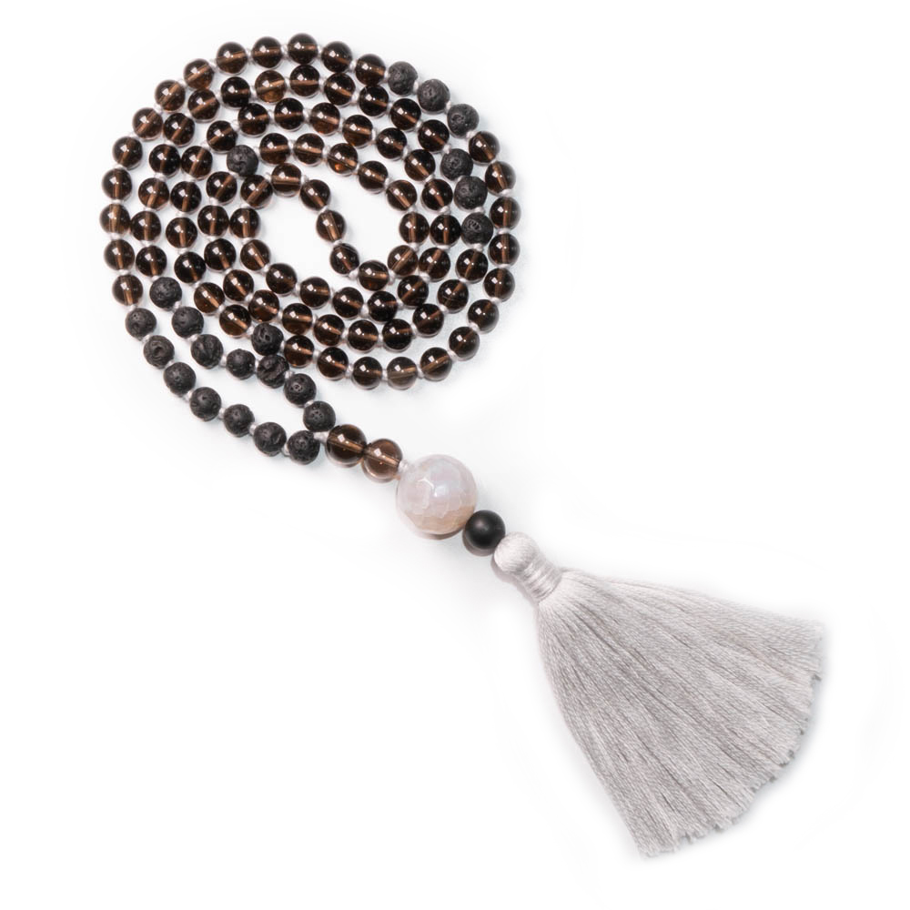 Smokey Quartz, Lava Stone & Agate – Temple Meditation Mala Necklace